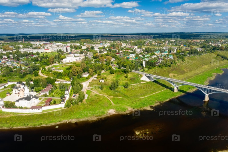 Вид с высоты на город Старицу и Свято-Успенский монастырь на берегу Волги