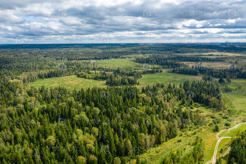 Вид с воздуха на проселочную дорогу через поля и леса