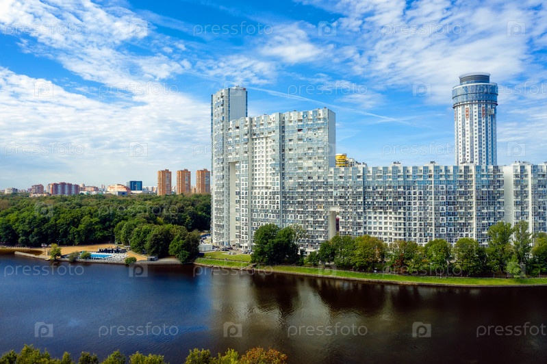 Вид с воздуха на жилые дома в городе Химки на берегу канала им. Москвы