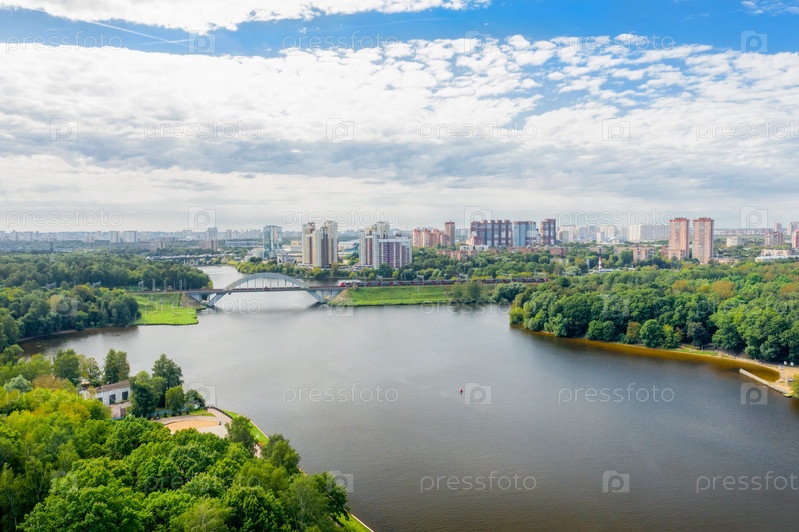 Вид с воздуха на жилые дома в городе Химки и железнодорожный мост через канал им. Москвы
