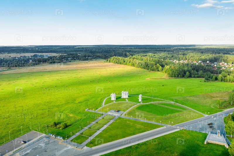 ДУБОСЕКОВО, Московская область, Россия - 20 августа 2020 года. Вид сверху на Мемориал героям-панфиловцам, посвященный 28 воинам Красной Армии. Большая каменная статуя воинов в поле на страже границы