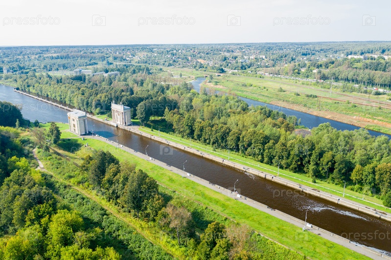 Вид с воздуха на ворота на канале им. Москвы в летний день