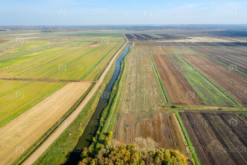 Вид сверху на сельскохозяйственные поля в осенний день