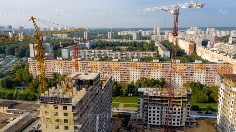 Строятся новые высотные многоквартирные дома. Аэрофотоснимок солнечным вечером