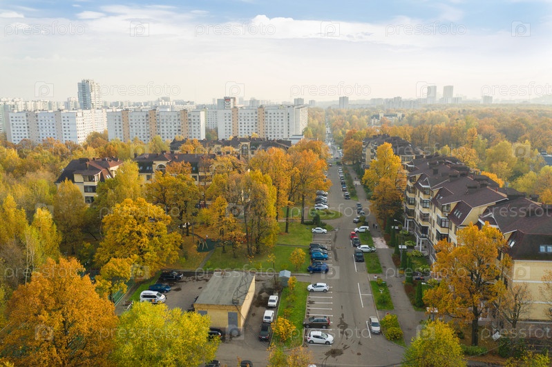 Вид с воздуха на Москву, район Лианозово, из городского парка в пасмурный осенний день