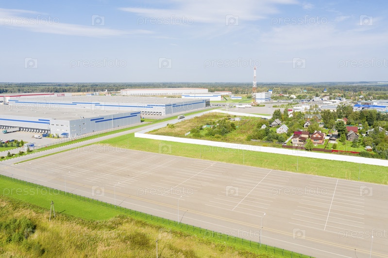 Вид с воздуха на складские здания бизнес-парка в сельской местности