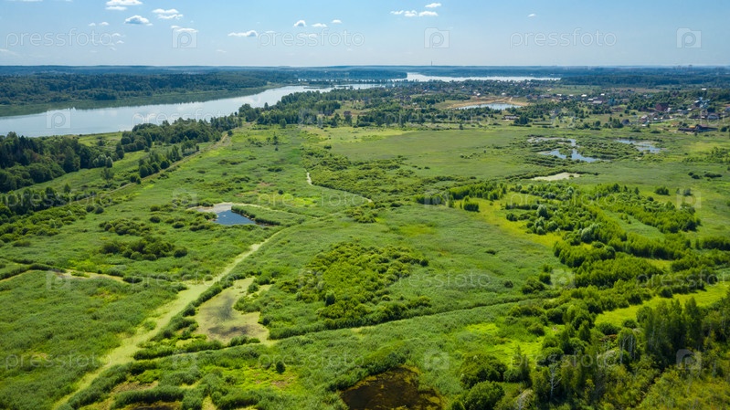 Вид с воздуха на болото в лесу в летний день