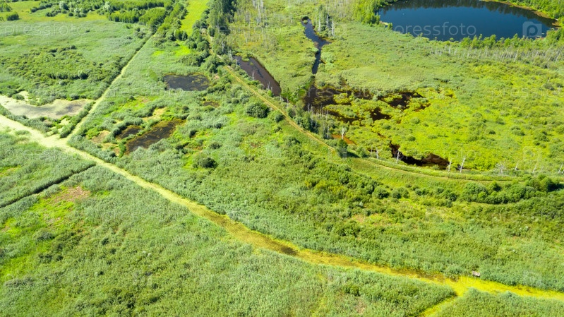 Вид с воздуха на болото в лесу в летний день