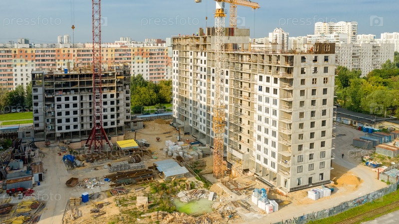 Строятся новые высотные многоквартирные дома. Аэрофотоснимок солнечным вечером