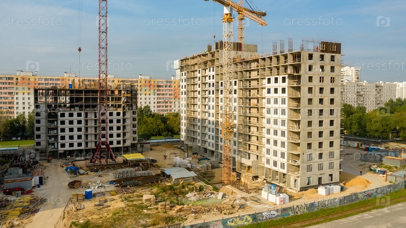 Строятся новые высотные многоквартирные дома. Аэрофотоснимок солнечным вечером