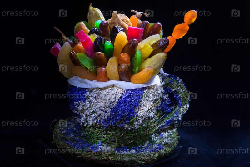 Сухофрукты в чашке из плетеных разноцветных трав