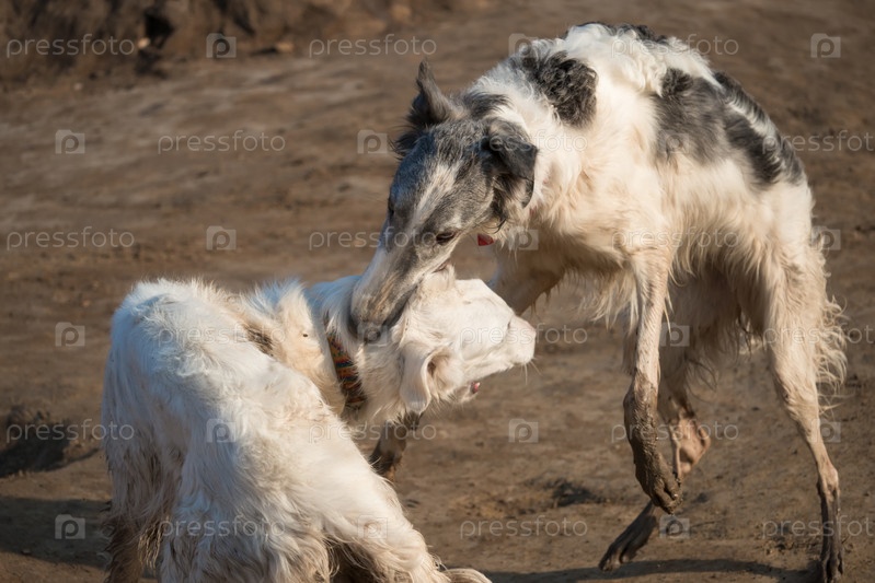 Собаки породы русская длинношерстная борзая, также называемая русским волкодавом, играют в охотничьи игры
