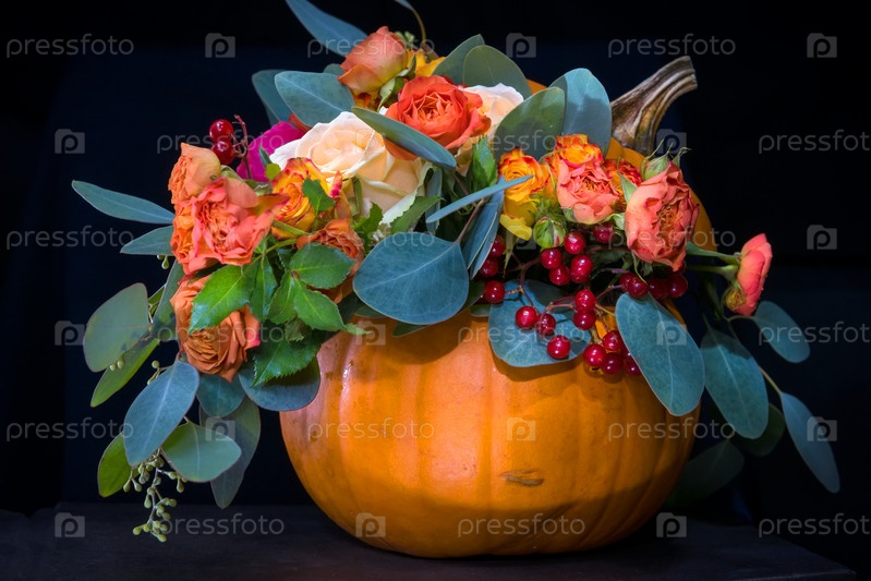 Букет цветов в тыкве как в вазе на черном фоне