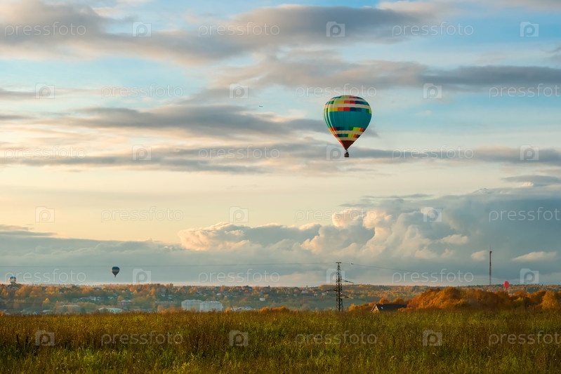 Красочный большой воздушный шар, летящий на фоне облачного неба в сельской местности осенним вечером