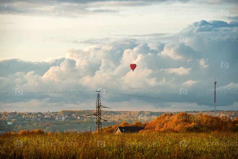 Красочный большой воздушный шар в форме сердца, летящий на фоне облачного неба в сельской местности осенним вечером