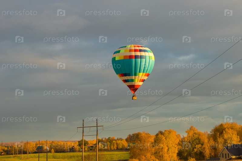 Красочный большой воздушный шар, летящий на фоне облачного неба в сельской местности осенним вечером