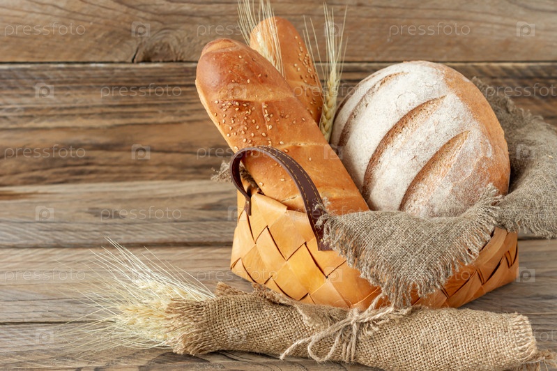 Состав различных хлебобулочных изделий в корзине на деревенском фоне. Домашняя свежая выпечка