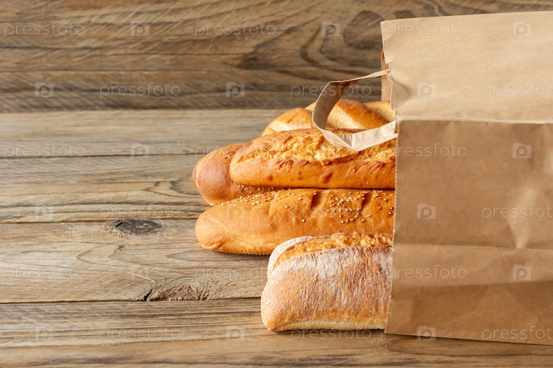 Французские багеты в бумажном пакете и пшеница на деревенском деревянном столе