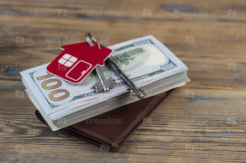Коричневый кожаный бумажник со стодолларовыми купюрами на деревянном столе. Вид сверху