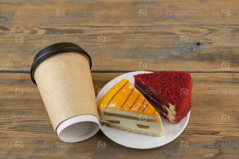 Красный бархатный сливочный сыр с черным кофе в бумажной чашке, деревянный фон