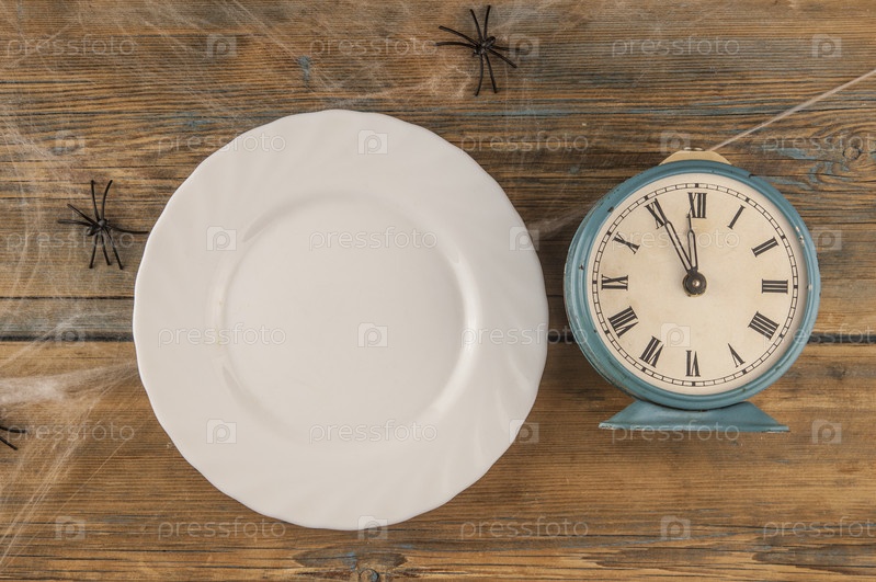 Блюдо таблицы хеллоуина пустое с паутиной на деревянной предпосылке Взгляд сверху. Плоская планировка, вид сверху модная праздничная концепция