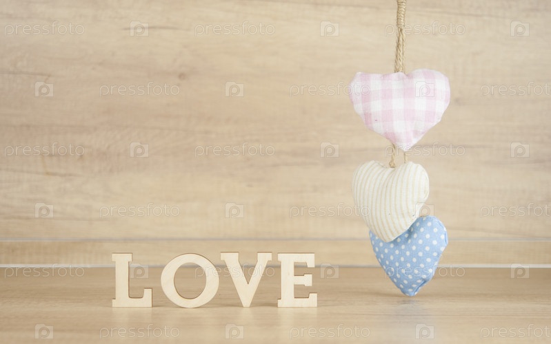 Слово любовь из деревянных букв с красочными сердцами ткани на фоне дерева. С днем Святого Валентина