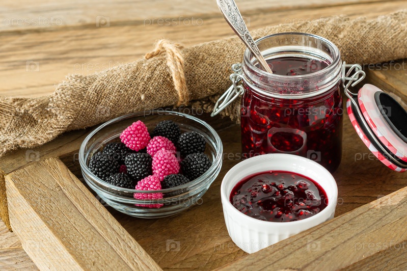 Жевательные мармеладные желейные конфеты с ягодным вкусом на деревянном столе с джемом в стеклянной банке