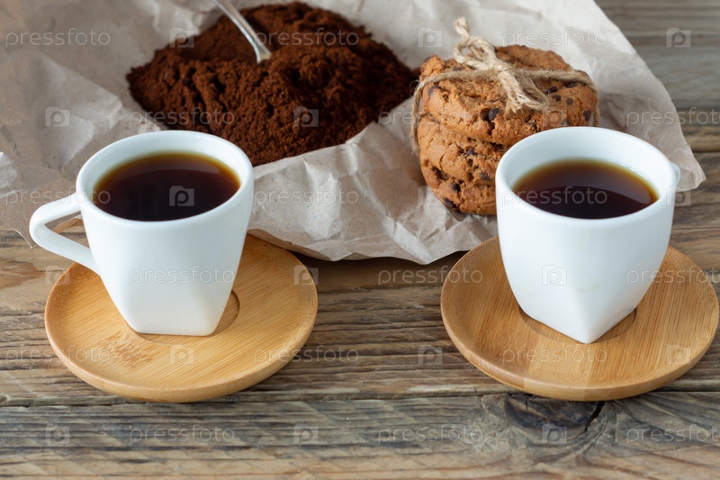 Две чашки свежесваренного эспрессо на деревянном столе. кофейные зерна на светлом деревянном столе, деревенский стиль, домашний