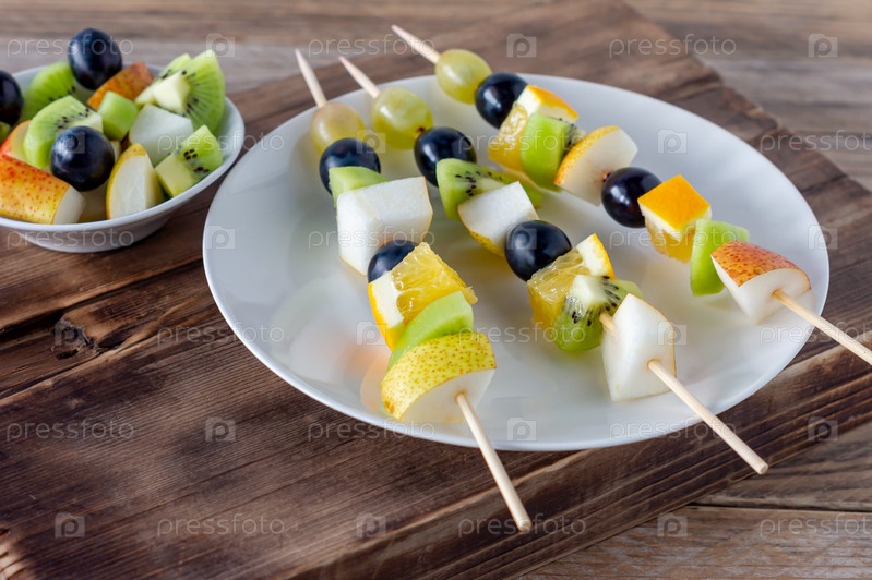 Фруктовые вегетарианские канапе на шпажках с виноградом, киви и манго на деревянном фоне. кейтеринг закуска