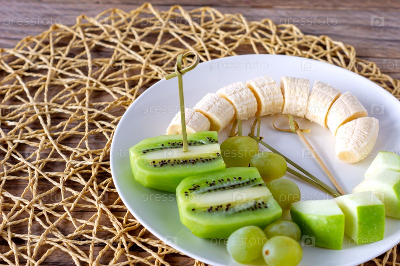 Веганский завтрак - разнообразные фрукты. Яблоки, бананы, киви и виноград на тарелке на сером деревянном столе, выборочный фокус, фруктовый салат