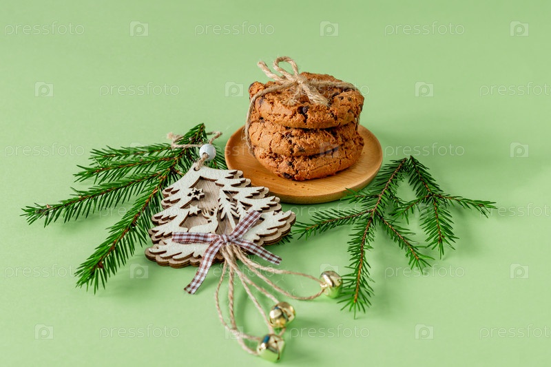 Рождественская композиция с шоколадным печеньем на зеленой бумаге с еловыми ветками и деревянной игрушкой. праздничная открытка