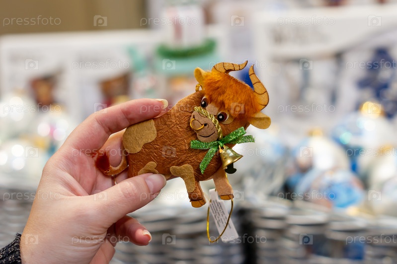 Москва, Россия - 15 декабря 2020 г.: Игрушки на рождественской ярмарке на выставке. Праздничное украшение для елки. Женская рука держит быка - символ 2021 года