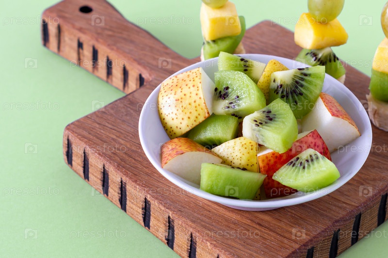 Веганский завтрак. разнообразие фруктов на деревянной разделочной доске, выборочный фокус, фруктовый салат