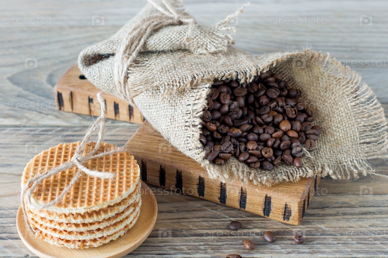 Ржаные арабские кофейные зерна в мешковине со стопкой голландских вафель на деревянном столе