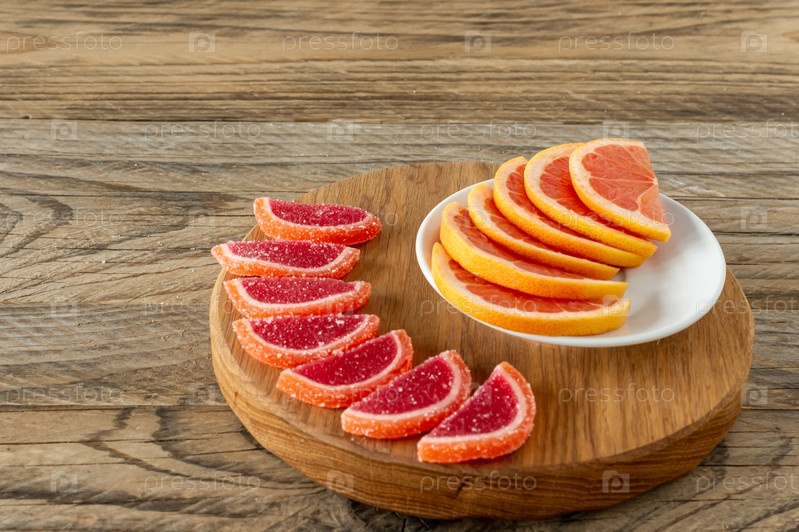 Кусочки цитрусового желе в сахаре. мармеладные дольки апельсинов и грейпфрутов на разделочной доске