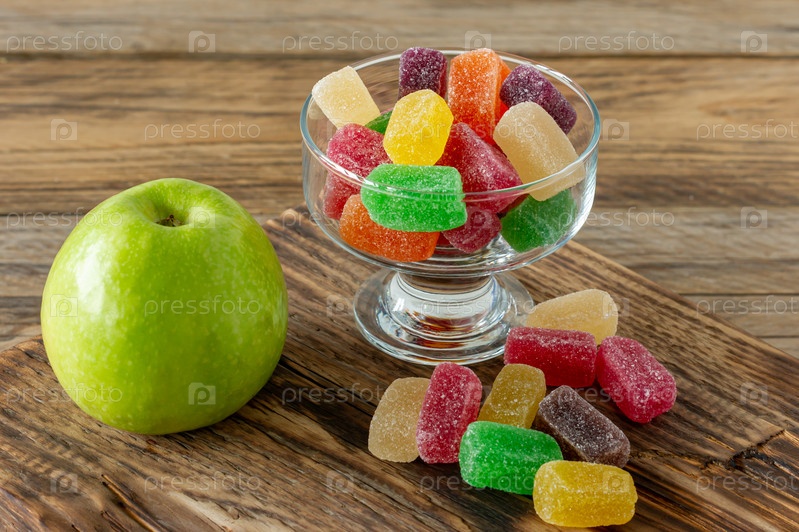 Фруктовые мармеладные конфеты, желейные конфеты на деревянном столе. Фруктовый натуральный десерт с сахаром