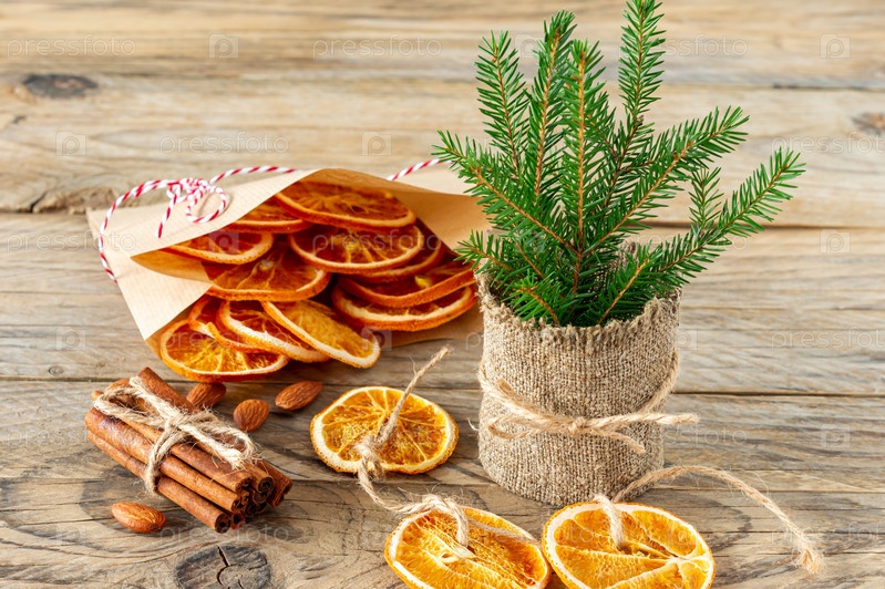 Рождественская композиция с еловыми ветками, палочками корицы и гирляндой из сушеных ломтиков апельсинов на деревянном фоне. Деревенский стиль