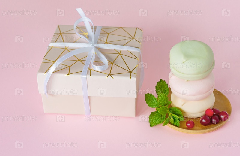 Подарочная коробка с домашним пастельным разноцветным зефиром. Яблочный зефир круглой формы. вкусный фруктовый десерт на розовом фоне