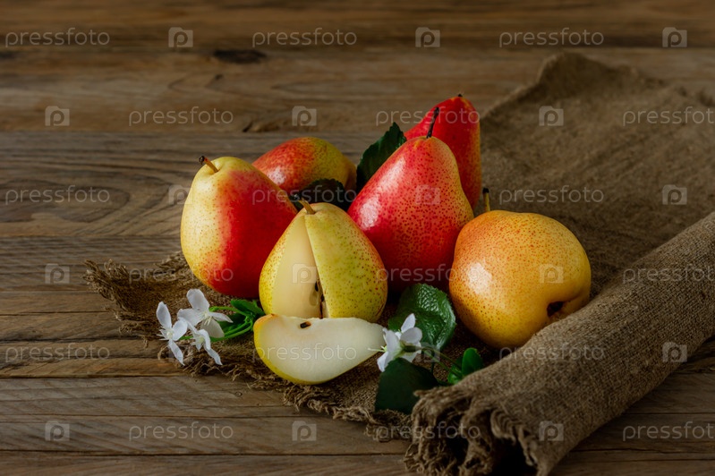 Спелые плоды груши. Собранная органическая груша на мешковине на деревянном столе. Осенний урожай