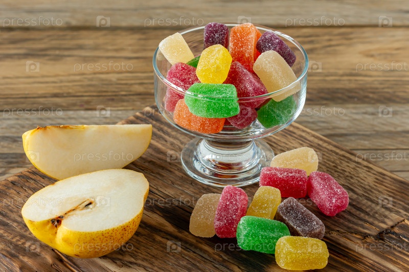 Фруктовые мармеладные конфеты, желейные конфеты на деревянном столе. Фруктовый натуральный десерт с сахаром