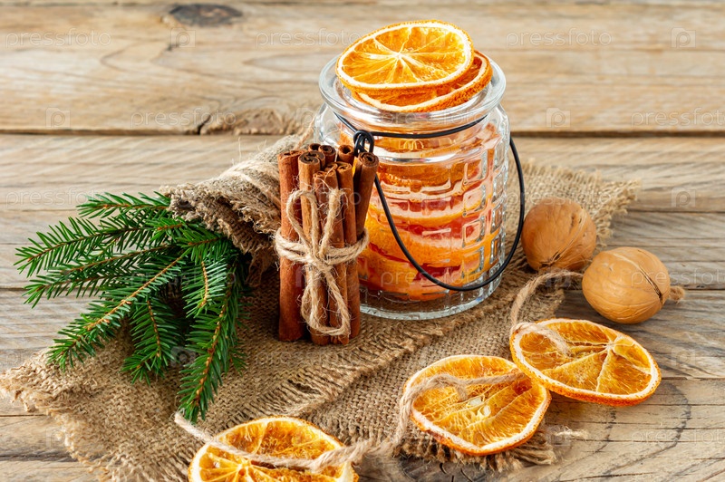 Рождественская композиция с еловыми ветками, палочками корицы и гирляндой из сушеных ломтиков апельсинов на деревянном фоне. Деревенский стиль