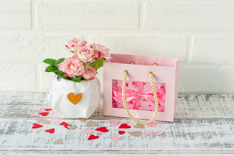 Праздничная открытка на праздники. Красивый букет розовых роз и подарочная коробка на деревянном фоне