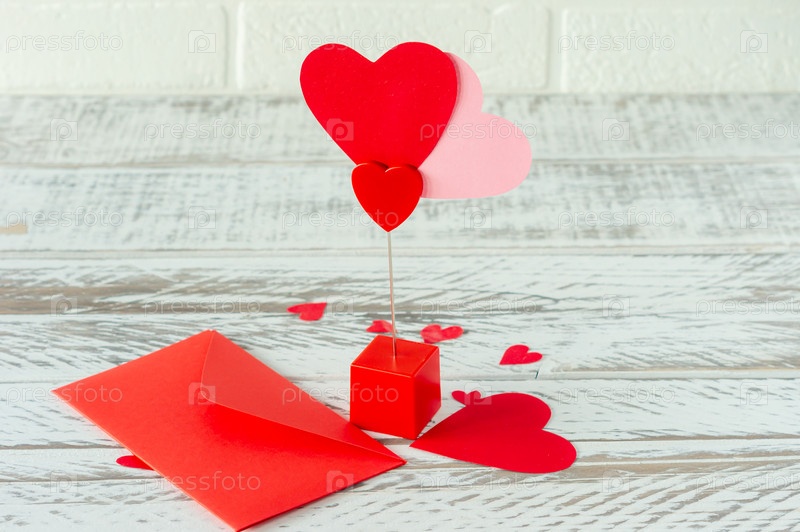 Держатель с конвертом с любовным письмом. Открытка на день Святого Валентина на деревянном фоне. Праздничная открытка с бумажными сердечками