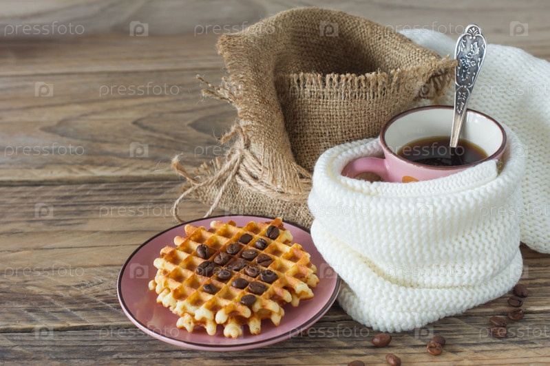 Чашка свежесваренного кофе американо с бельгийскими вафлями на деревянном столе. кофейные зерна на светлом деревянном столе, деревенский стиль, домашний