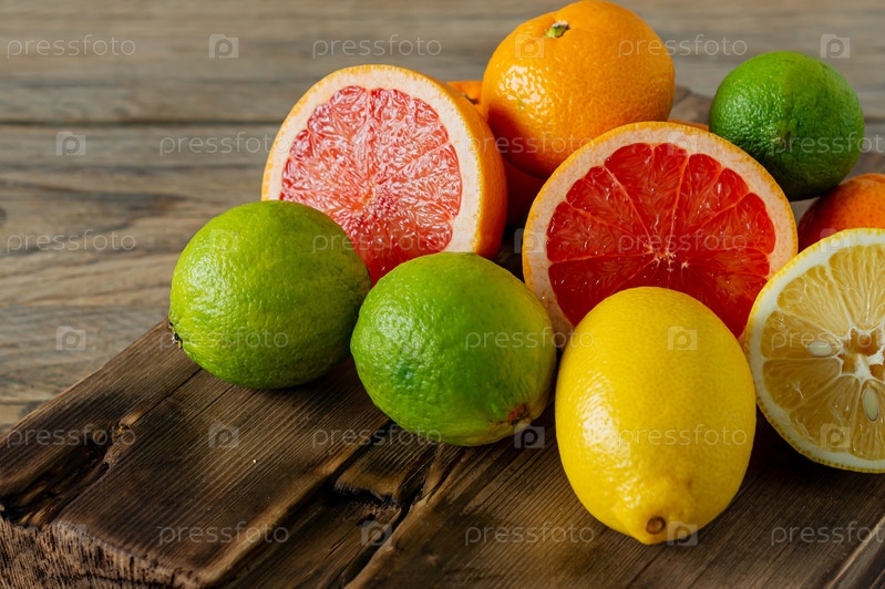 Половинки свежих цитрусовых на деревянном фоне. Кольца апельсина, грейпфрута, лайма, лимона, мандарина