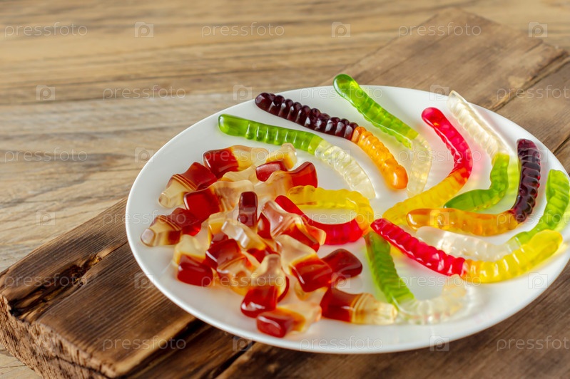 Ассортимент желейных конфет на тарелке. Вкусные угощения и нездоровая пища