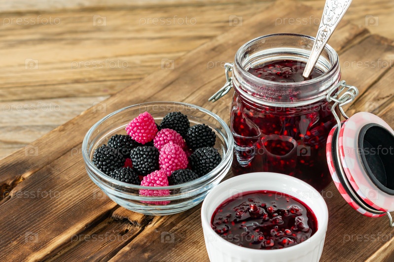 Жевательные мармеладные желейные конфеты с ягодным вкусом на деревянном столе с джемом в стеклянной банке