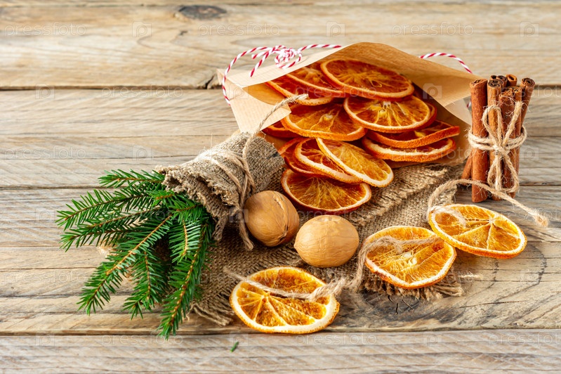 Рождественская композиция с еловыми ветками, палочками корицы и гирляндой из сушеных ломтиков апельсинов на деревянном фоне. Деревенский стиль