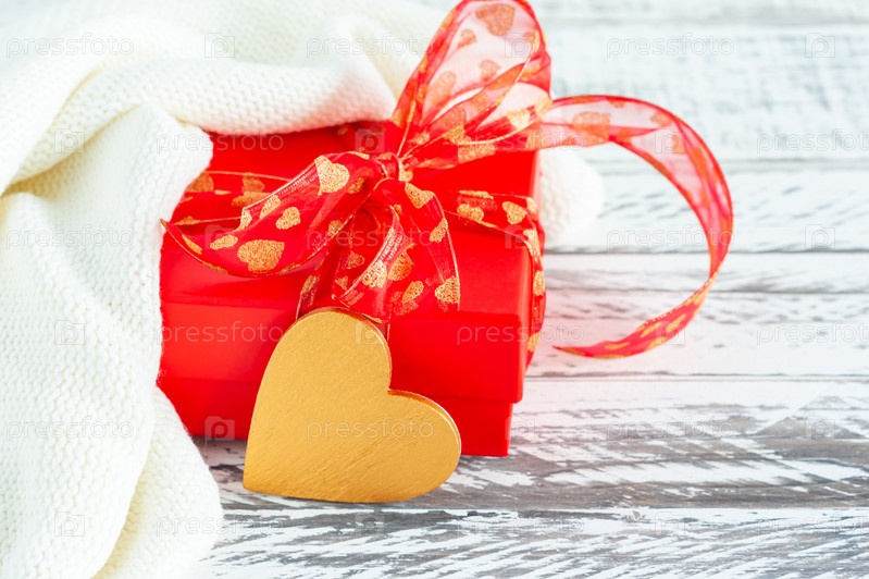 Подарочная коробка из красной бумаги с красным ленточкой и золотом. сердце на деревянном фоне. Cose стиль жизни композиция на День святого Валентина или день рождения