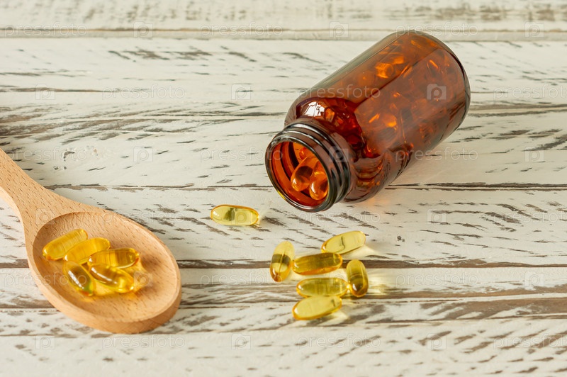 Капсулы с рыбьим жиром на деревянном фоне и текстуре, витамин D, омега-добавка, селективный фокус